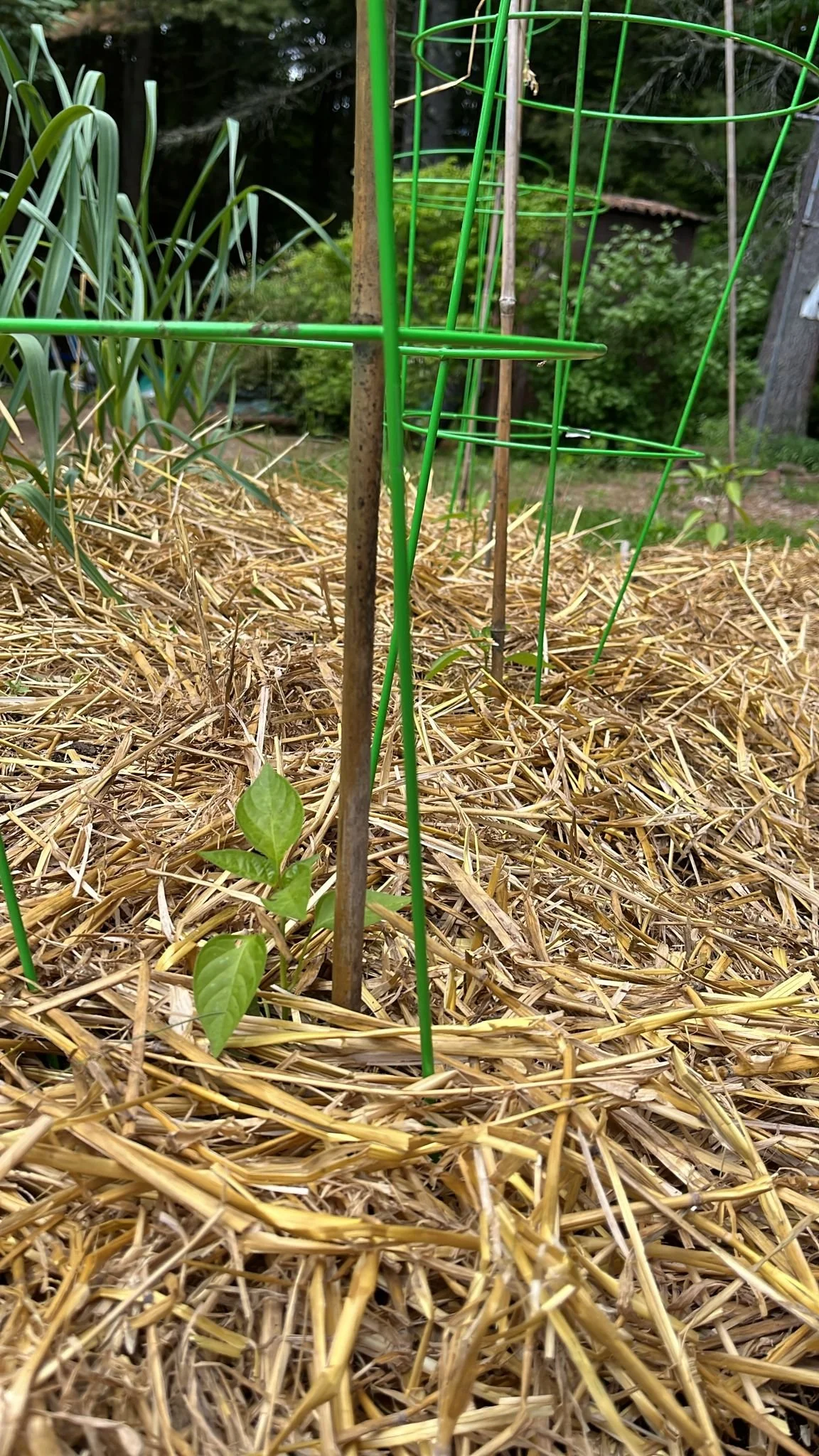 It's been a challenge lining out rows, digging holes, and amending with composts and fertilizer. I'm eternally grateful that I prepped the major gardens last fall by weeding and then blanketing these areas heavily with 3+" of shredded leaves and straw. Because we only use Blue Seal Safe 'N Simple lawn care products, all my chopped-up oak and elm leaves from the last end-of-season lawn mowings end up in gardens and are never wasted. As a no-till gardener, I rake aside this mulch to plant and then return it between rows and around the plants. Now I'm staking and caging all the tomatoes, peppers, and eggplants (somewhere close to 50).